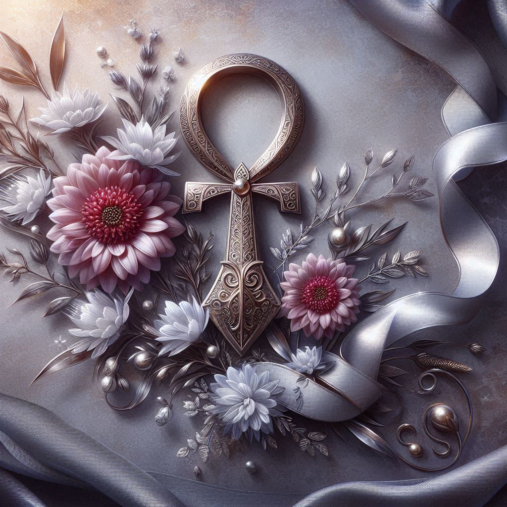 flowers with a silver ankh and flowing metallic ribbon, 1920x1080 resolution,...